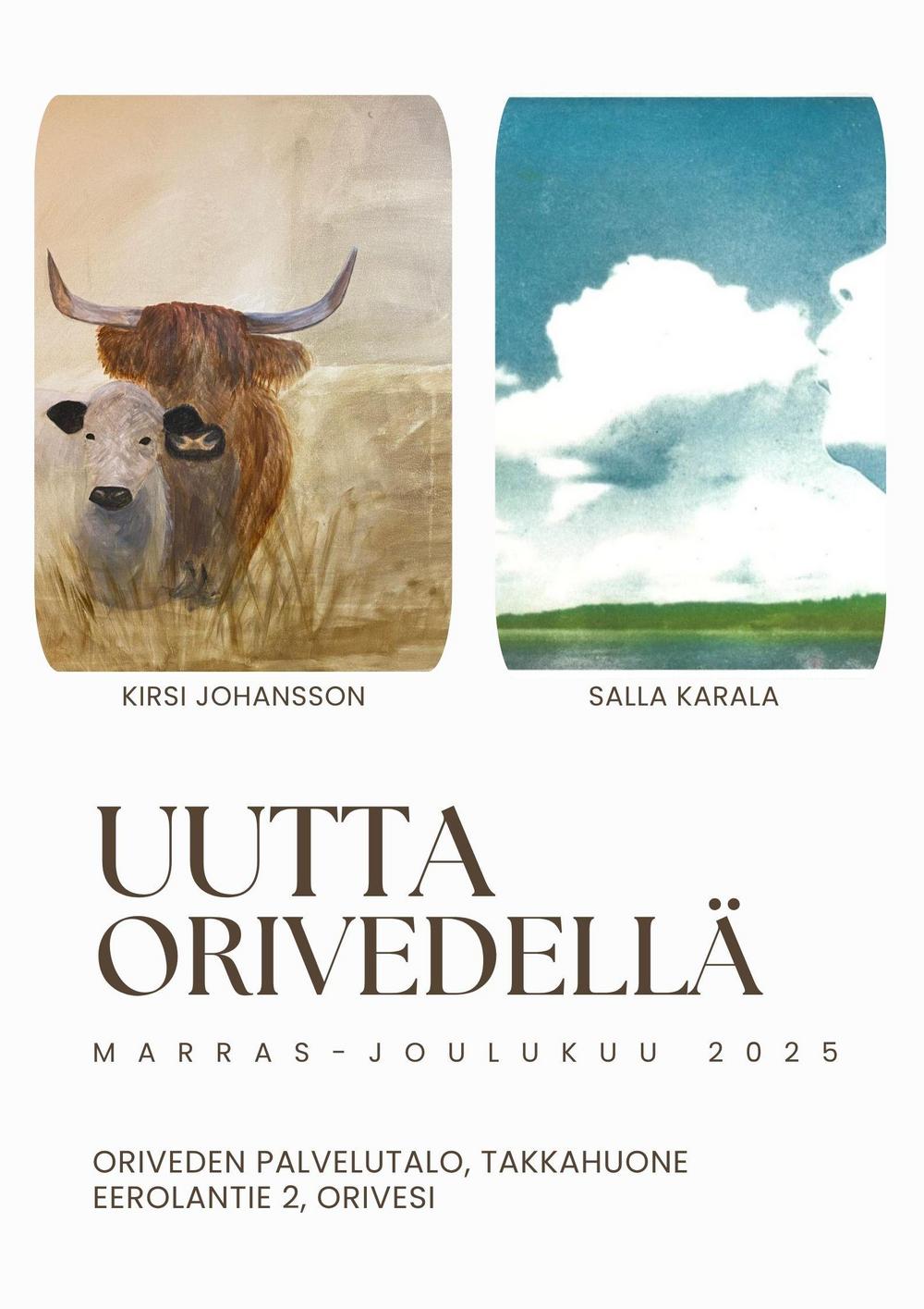 Oriveden Palvelutalon Takkahuoneessa on marras–joulukuussa nähtävillä kahden Ylä-Hämeen taiteilijaseuran jäsenen, Kirsi Johanssonin ja Salla Karalan, näyttely "Uutta Orivedellä".